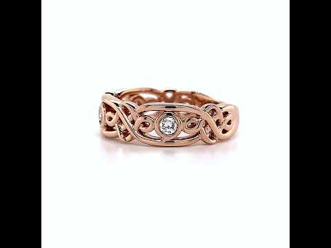 This beautiful Moissanite right features a Celtic design with 0.18ct of bezel set round brilliant cut colorless Moissanite stones, set in your choice of 14k gold, 18k gold or platinum.