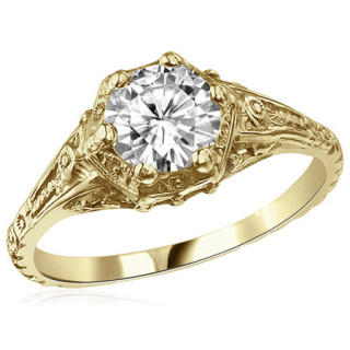 This beautiful antique reproduction filigree ring is designed with a 6mm/ 0.75 carat round brilliant cut Moissanite center stone. Available in 14k white or yellow gold.