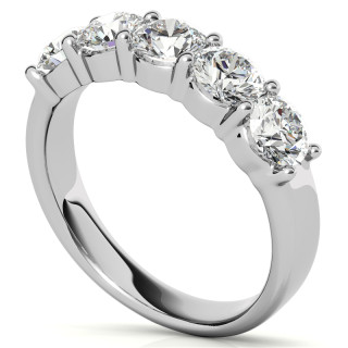 This beautiful classic shared prong anniversary band features five 1/3ct round brilliant cut Moissanites for a total of 1.75ct. It is available in 14k gold, 18k gold and platinum. The band measures approximately 4.4mm in width and tapers down to approximately 3.3mm at the bottom.