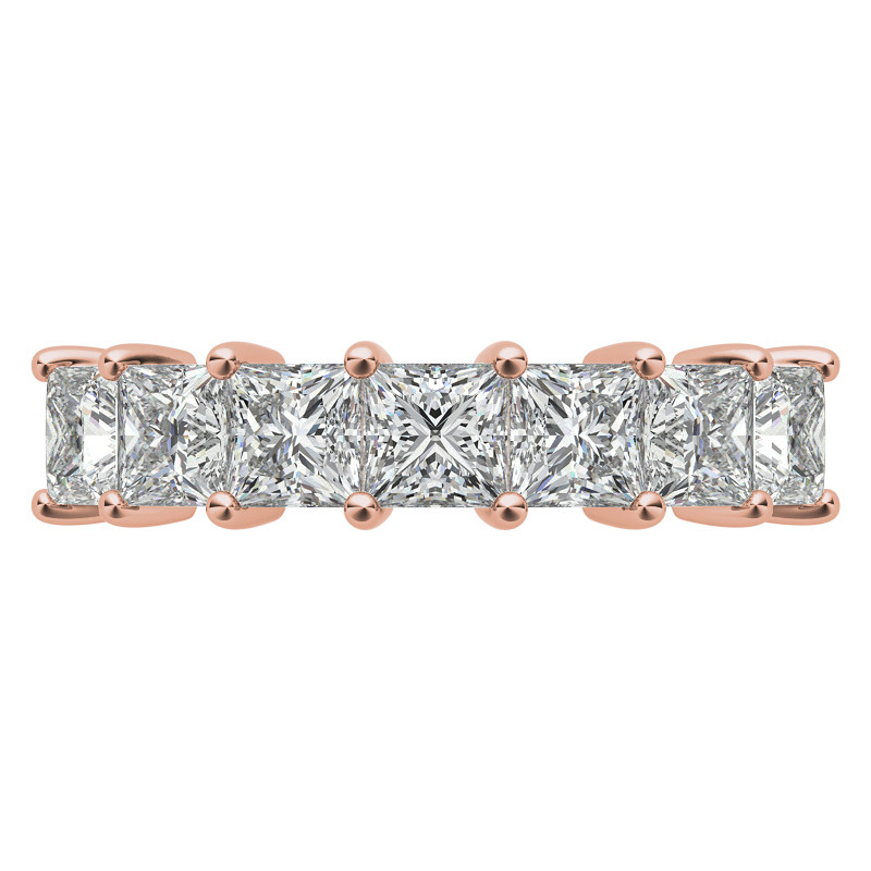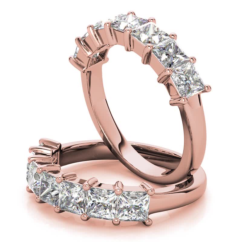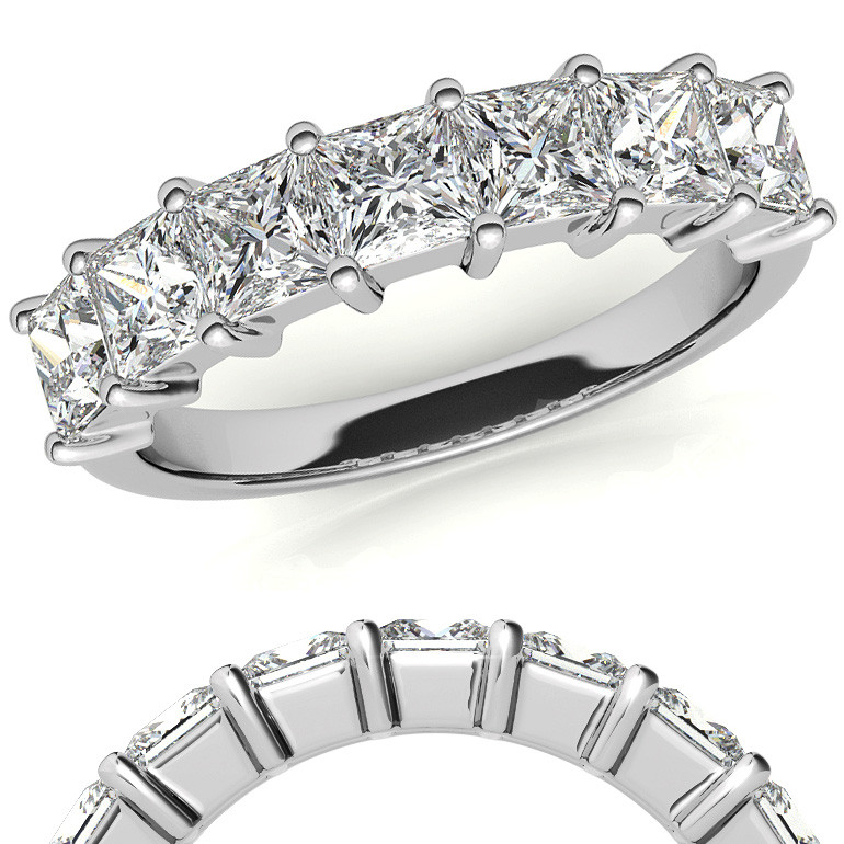 This beautiful classic shared prong anniversary band features seven 3.5mm princess cut Moissanites for a total of 1.9ct. It is available in 14k gold, 18k gold and platinum. The band measures approximately 3mm in width.