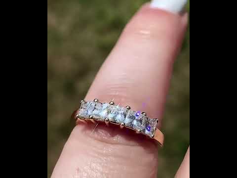 This beautiful classic shared prong anniversary band features five 3mm princess cut Moissanites for a total of 0.9ct. It is available in 14k gold, 18k gold and platinum. The band measures approximately 2.5mm in width.