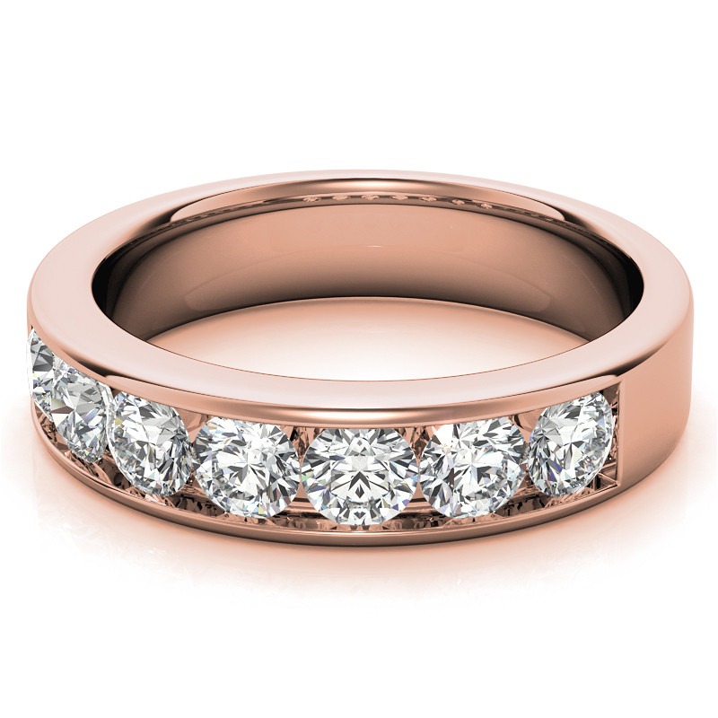 This beautiful channel set anniversary ring features seven 3.5mm (0.15ct each) round brilliant Moissanite stones for a total of 1.05 carat, set in 14k gold, 18k gold or platinum.