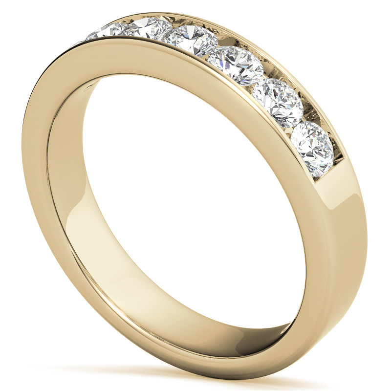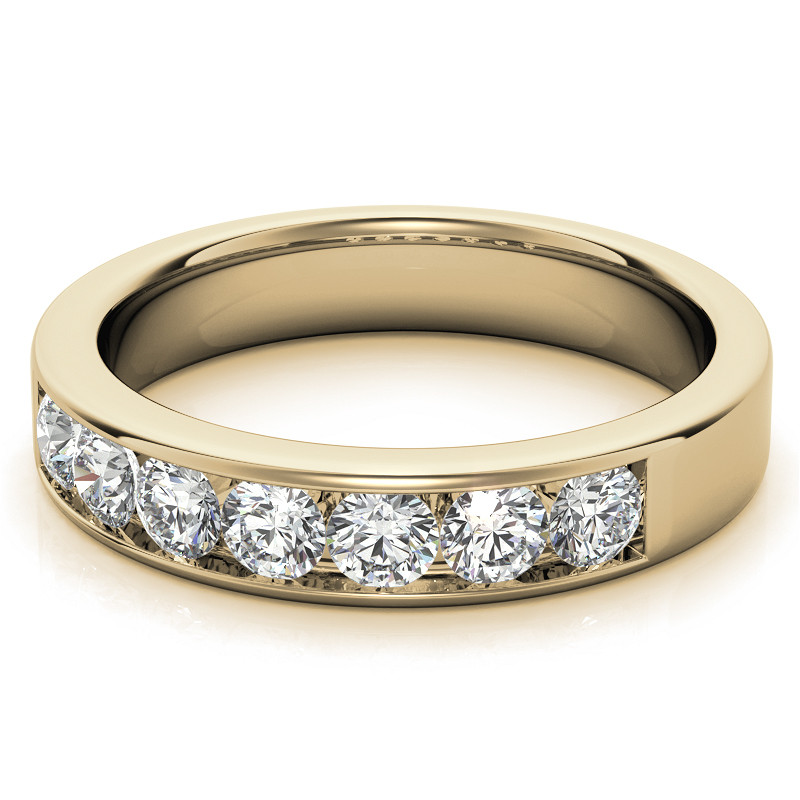 This beautiful anniversary band features a classic channel set design with seven 3mm/0.10ct round brilliant Moissanites for a total of 0.70ct, set in 14k gold, 18k gold or platinum.