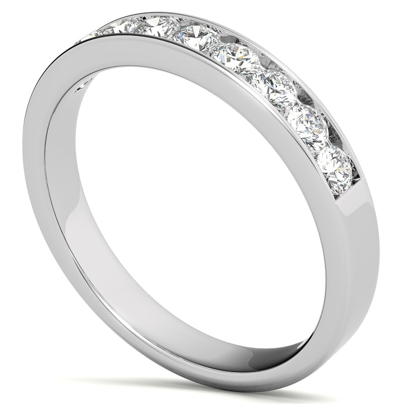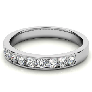 This beautiful channel set anniversary ring features nine 2.5mm (0.06ct each) round brilliant Moissanites for a total of 0.54 carat, set in 14k gold, 18k gold or platinum.