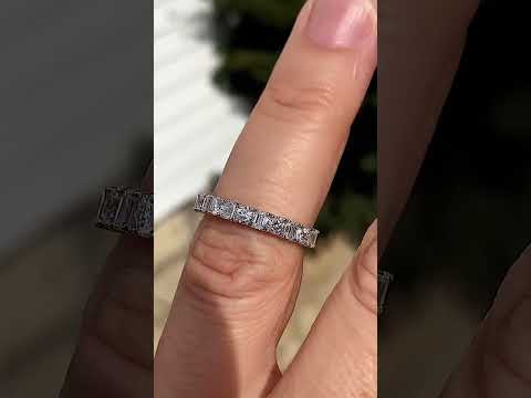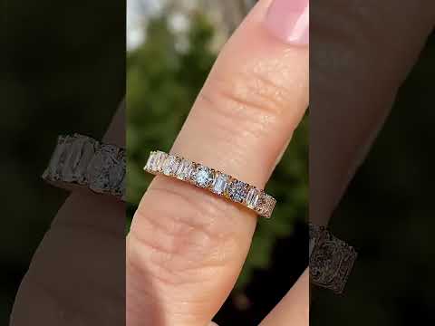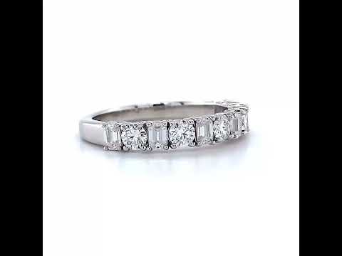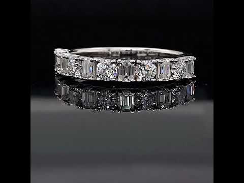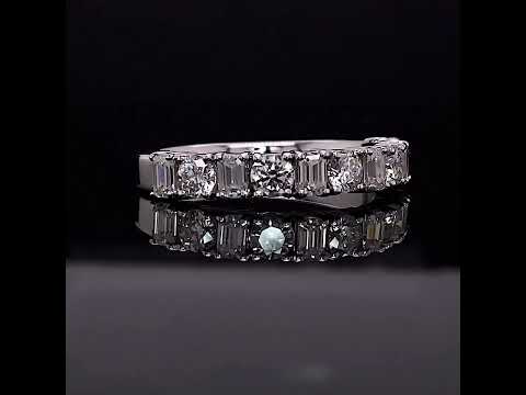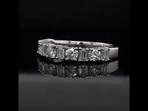 This beautiful Moissanite anniversary ring features 0.98ct of 3.0mm/0.10ct round brilliant and six 3x2mm/0.08ct emerald cut Moissanite gemstones, set alternating in an elegant design. The ring can be cast in your choice of 14k gold, 18k gold, or platinum and has a band width of approximately 2.0mm at the base of the ring and 3mm at its widest point.