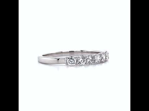 This beautiful anniversary band features a low profile shared-prong design, seven 2.5mm (0.06ct) round brilliant Moissanite stones for a total of 0.42ct, set in 14k white gold, 14k yellow gold, 14k 2-tone gold (yellow gold band, white gold settings), or platinum.