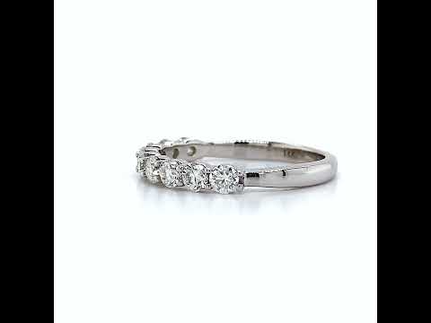 This beautiful Moissanite anniversary band features a shared prong design with nine 2.7mm/0.08ct round brilliant colorless Moissanite stones (0.72tcw), cast in your choice of 14k gold, 18k gold or platinum.