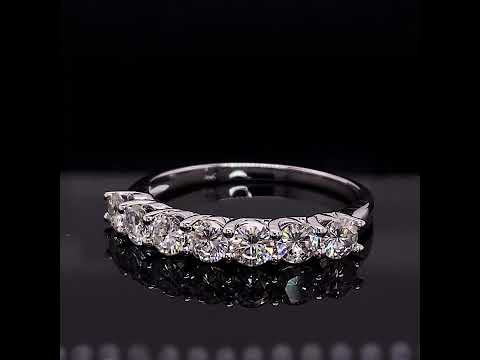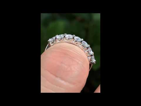 This beautiful anniversary band features a low profile shared-prong trellis design, seven 3.5mm (0.15ct) round brilliant Moissanite stones for a total of 1.05ct, set in 14k white gold, 14k yellow gold, 14k 2-tone gold (yellow gold band, white gold settings), or platinum.