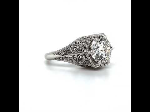 This beautiful antique reproduction filigree ring is designed with a 9.0mm/ 3.0 carat round brilliant cut Moissanite center stone. Available in 14k white or yellow gold.