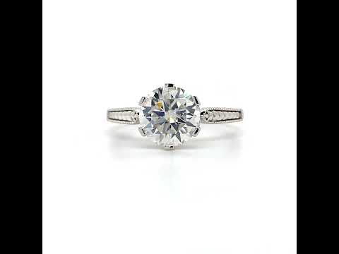 This beautiful antique reproduction filigree ring is designed with a round brilliant Moissanite center stone. Available in solid 14k white or yellow gold.
