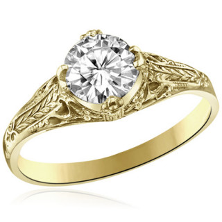 This beautiful antique reproduction filigree ring is designed with a 6.5mm/ 1.0 carat round brilliant cut Moissanite center stone. Available in 14k white or yellow gold.