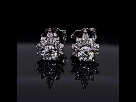 These beautiful Moissanite earrings feature a lotus inspired design with two 3.5mm round colorless Moissanite gemstones, two 3x1.5mm marquise cut and 0.13ct of smaller round cut colorless Moissante side stones in 14k white, yellow, or rose gold.