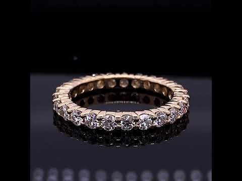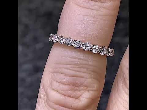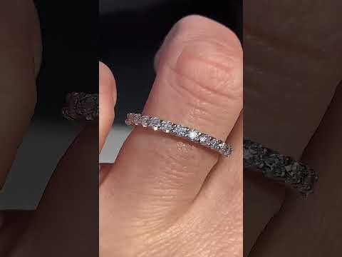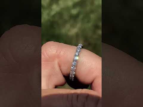 This beautiful eternity ring features a shared prong design with 2.5mm round brilliant Moissanite gemstones, set in 14k gold, 18k gold or platinum. The total carat weight is 1.26ct to 1.44ct depending on the ring size that is chosen.