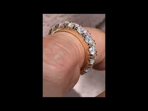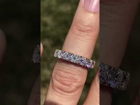 This beautiful eternity ring features a 4 prong eternity design, 4.5mm / 0.33ct round brilliant Moissanites, cast in 14k gold, 18k gold or platinum. The total carat weight varies from 4.6ct - 5.3ct depending on the ring size selected.