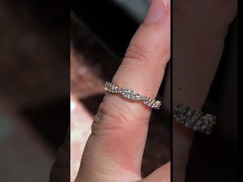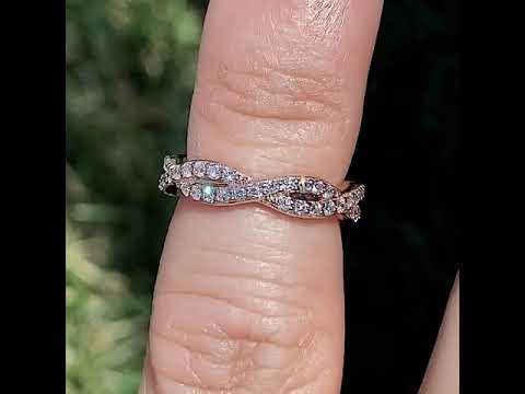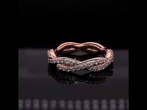 This beautiful eternity ring features an infinity style design with round brilliant Moissanite stones (0.66ct), set in 14k gold. The width of the band is approximately 3.5mm in width and 2mm in height.