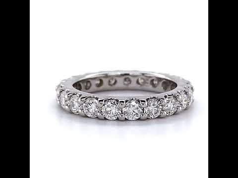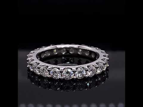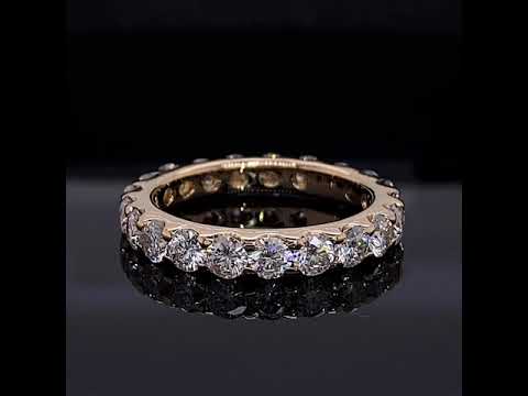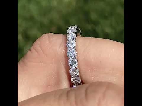 This beautiful eternity ring features a low profile shared prong design with 2.4 - 2.2ct of 3mm round brilliant Moissanite stones, set in 14k gold.