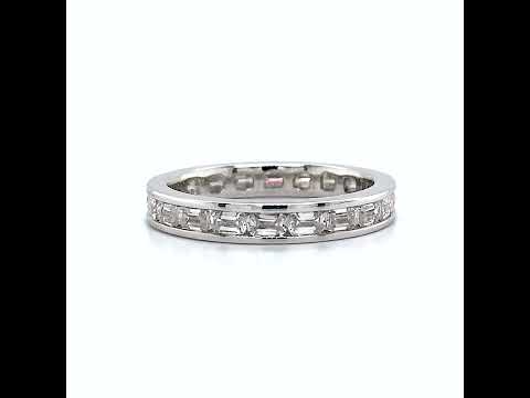 This beautiful Moissanite eternity band features channel set 3x2mm emerald cut Moissanite gemstones, set in your choice of 14k gold, 18k gold, or platinum. The total carat weight ranges between 1.44ct - 1.76ct depending on selected ring size.