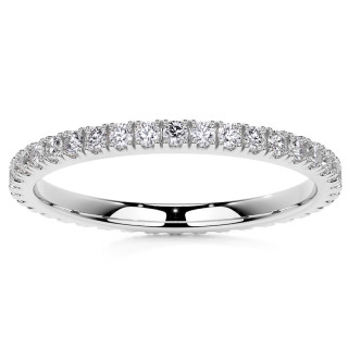 This beautiful eternity band features a split prong design with colorless round brilliant cut Moissanites. It is available in 14k gold, 18k gold or platinum. Each stone measures 1.5mm (0.015ct each), and the total carat weight varies from 0.5ct - 0.6ct depending on the ring size chosen.