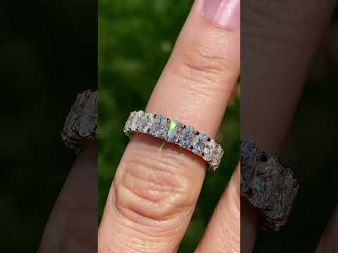 This beautiful eternity band features a u-prong design with oval brilliant cut Moissanites. It is available in 14k gold, 18k gold or platinum. Each stone measures 5x3mm (0.25ct each), and the total carat weight varies from 5.4ct - 6.2ct depending on the ring size chosen.