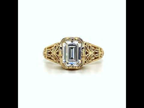This beautiful antique reproduction filigree ring is designed with a 7x5mm, 1ct or 8x6mm, 1.5ct emerald cut Moissanite center stone.
