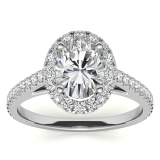 Our carefully crafted design features a petite cathedral setting with a beautiful halo, embracing an oval cut Moissanite center stone, perfectly adorned with 0.38ct - 0.44ct of colorless Moissanite side stones.