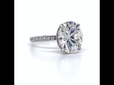 This exquisite piece boasts an oval cut Moissanite center stone, elegantly surrounded by a diamond hidden halo collar. It features colorless Moissanite side stones to perfectly complement the center stone.