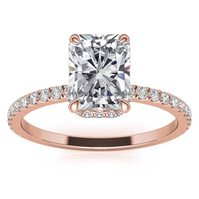 This elegant piece features a hidden diamond halo that gracefully encircles the base of the center stone prongs, exquisitely complementing the emerald or radiant cut colorless Moissanite center stone for a sophisticated and stunning look.