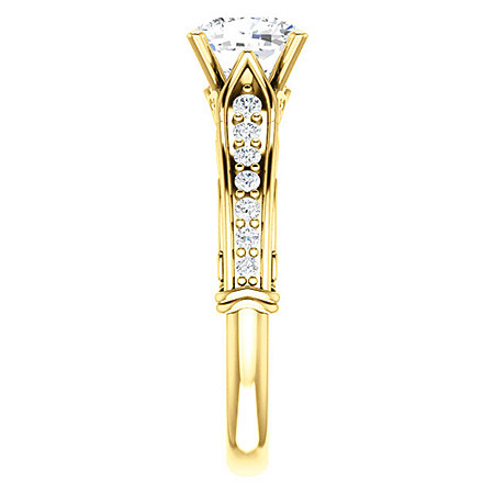 This Moissanite ring features a beautiful, designer inspired scroll design with 0.30ct of round brilliant cut Moissanite side stones, cast in 14k gold, with a cushion cut colorless Moissanite center stone.