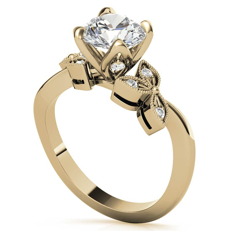 Indulge in the beauty of nature with this stunning engagement ring, featuring a captivating floral design that embodies grace and femininity. The centerpiece of the ring is a round brilliant Moissanite, available in the size of your choice, held securely in place by four tulip-shaped prongs that are adorned with delicate round brilliant Moissanite accent stones, totaling approximately 0.10ct-0.14ct.