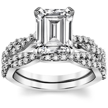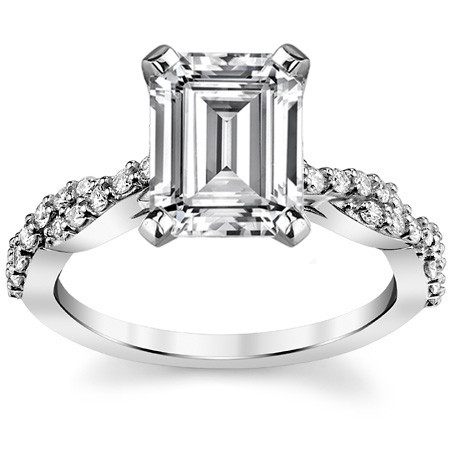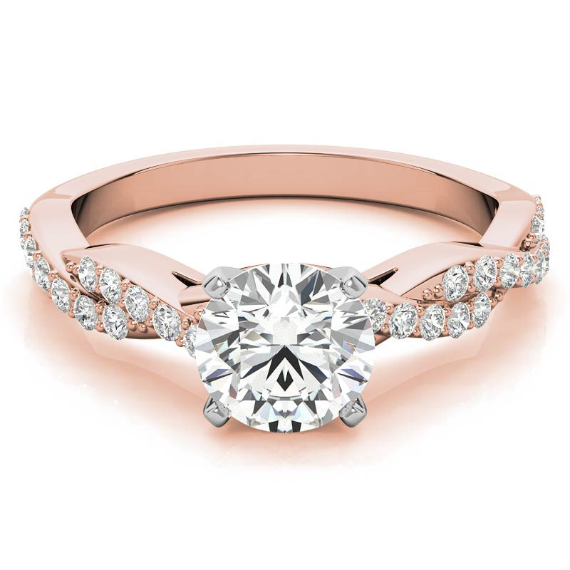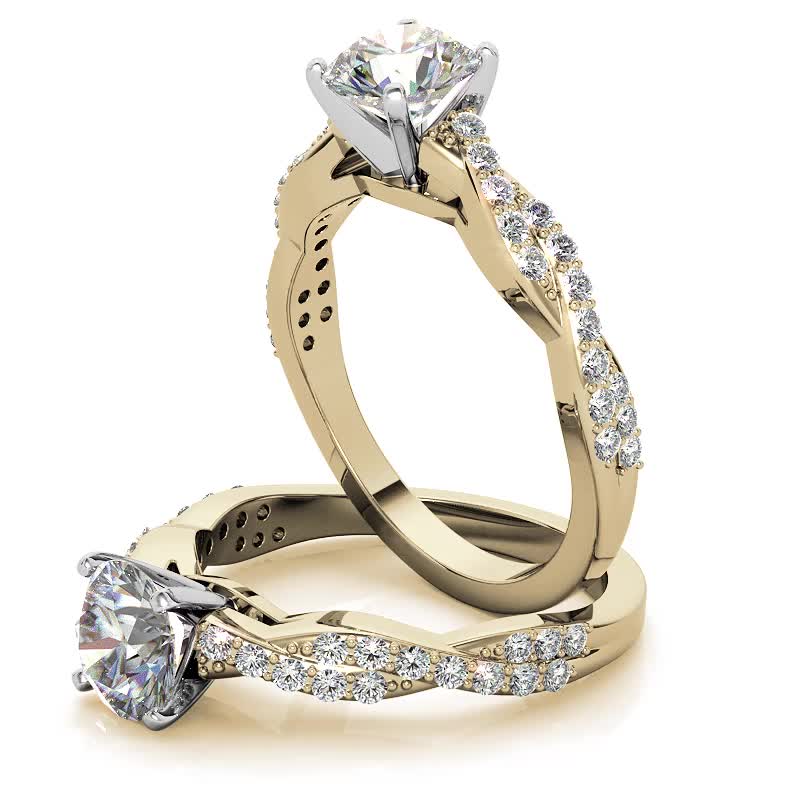 This Moissanite engagement ring features a twisted infinity style design with 0.30ct of round brilliant Moissanite side stones, set in 14k gold, 18k gold or platinum. The band measures approximately 2.9mm in width at the top, and tapers down to about 1.8mm at the bottom. Choose your center stone from our large collection of loose Moissanite gemstones.