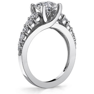 The band is adorned with round brilliant Moissanite side stones gradually increasing in size, totaling 0.50tcw, that lend a touch of opulence to the ring.