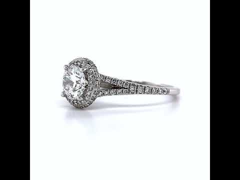 This stunning engagement ring features a split shank cathedral band that elegantly leads up to an encircled halo, which is adorned with beautiful stones on the top, sides, and under the center round brilliant Moissanite stone.