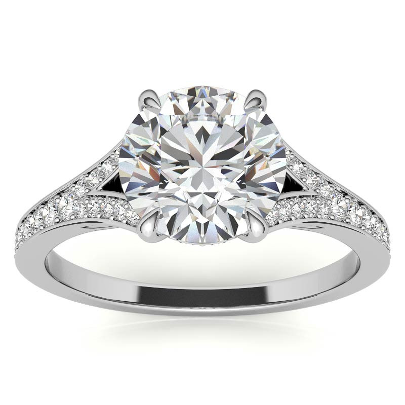This stunning cathedral engagement ring boasts an intricate split shank band and a unique hidden halo design, all beautifully accented with your choice of round brilliant cut Moissanite side stones.