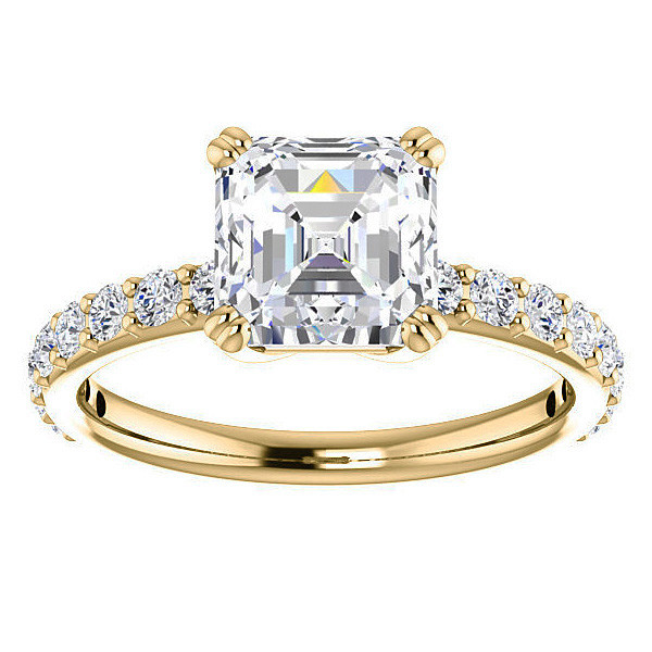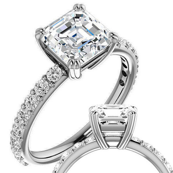 This beautiful engagement ring features a double prong design with an Asscher cut colorless Moissanite center stone, round brilliant Moissanite side stones (0.48ct), cast in 14k gold, 18k gold or platinum. It has an optional matching wedding band with 0.54ct of round brilliant Moissanite side stones.