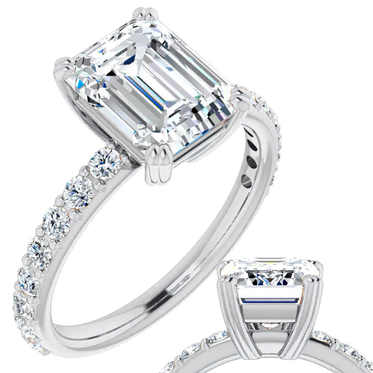 This beautiful engagement ring features a double prong design with an emerald cut Moissanite center stone, round brilliant Moissanite side stones (0.48ct), cast in 14k gold. It has an optional matching wedding band with 0.54ct of round brilliant Moissanite side stones.