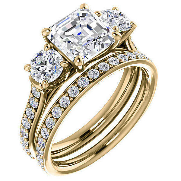 This beautiful engagement ring features a trellis 3-stone design, your choice of an Asscher cut colorless Moissanite center stone, two larger round brilliant Moissanite side stones (see below for sizes), and 0.24ct of round brilliant Moissanite side stones on the band. It is available in 14k gold. It has an optional matching band with 0.36ct of round brilliant Moissanite side stones.