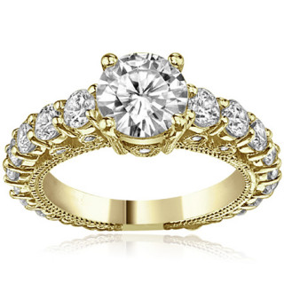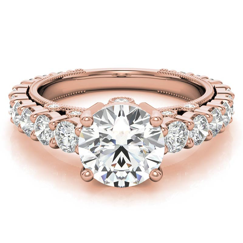 This beautiful antique milgrain style Moissanite ring features a round brilliant Moissanite center stone with round brilliant Moissanite side stones (1.65ct - 1.5ct) and is set in 14k gold, 18k gold or platinum.