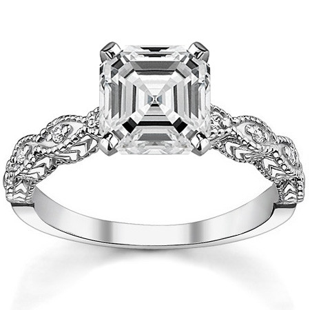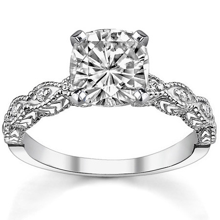 This beautiful Moissanite engagement ring features an antique milgrain design with 0.08ct of round brilliant Moissanite side stones, set in 14k gold, 18k gold or platinum.