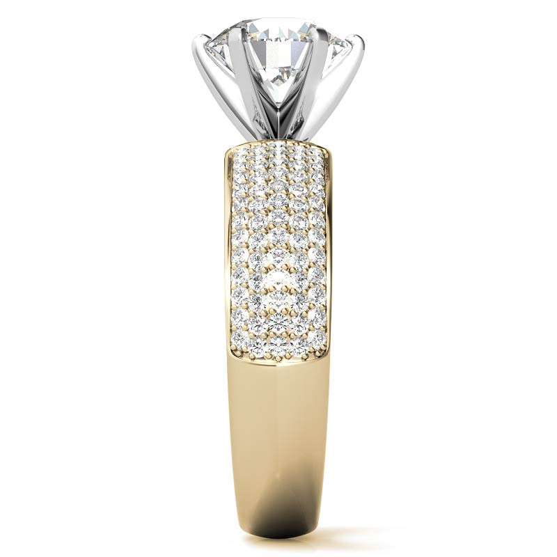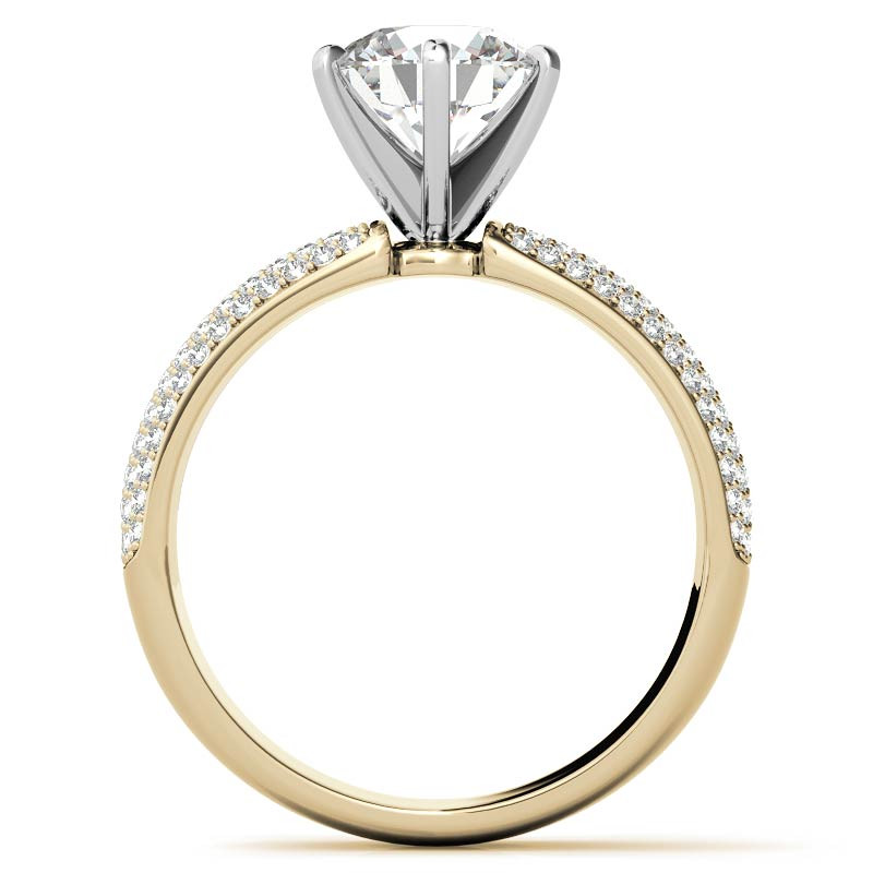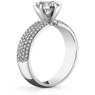 This beautiful engagement ring features a wider pave style design, 0.65 carat of round brilliant diamond side stones, set in 14k gold, 18k gold or platinum.