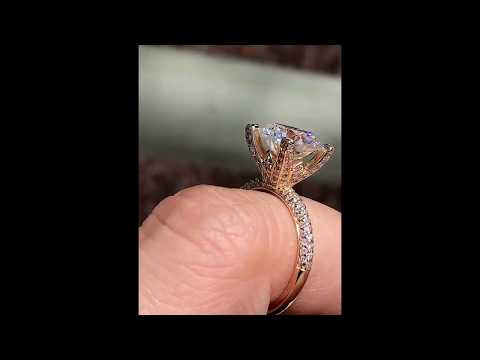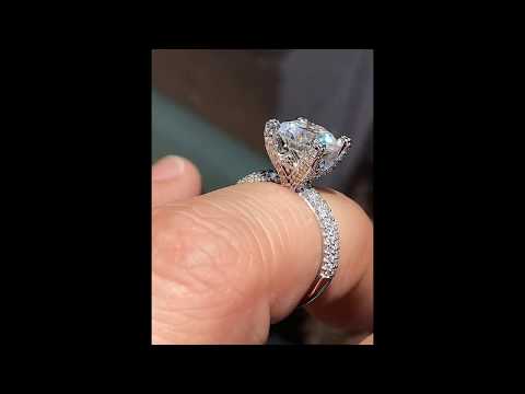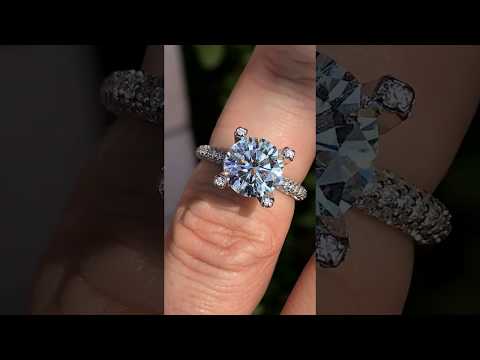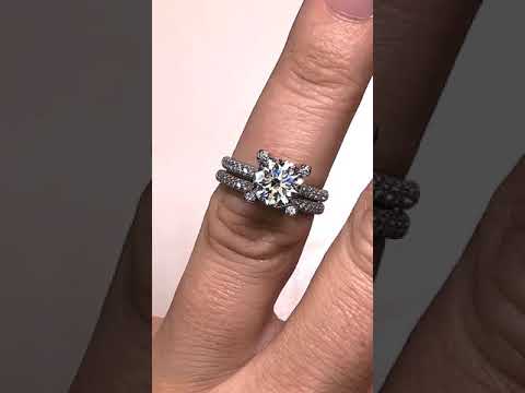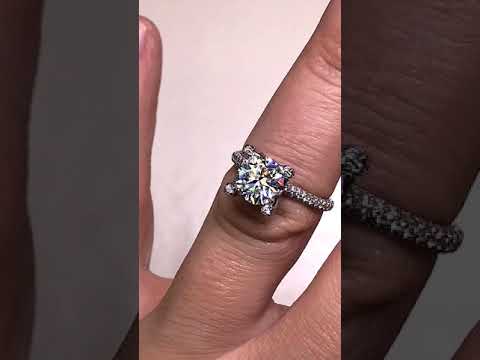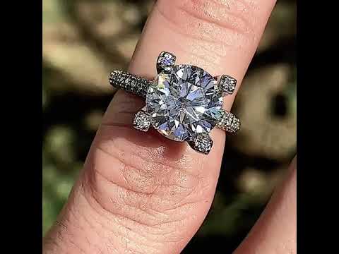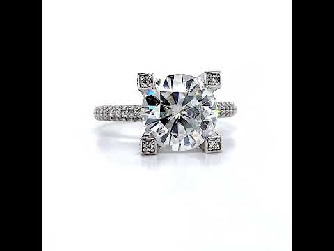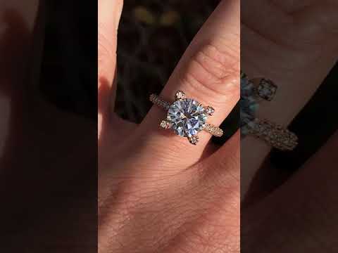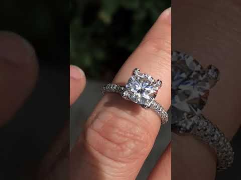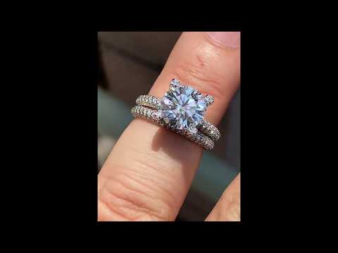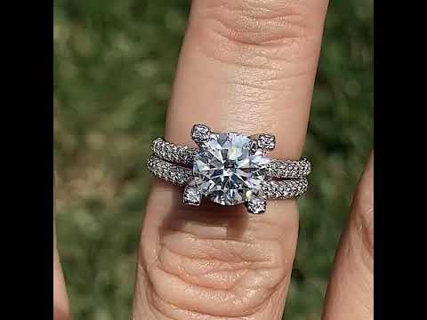 This beautiful Moissanite ring features an unique pave style design with colorless diamond accent stones on the top of the bands, head and top of prongs, set in 14k gold, 18k gold or platinum. The band measures about 2.5mm in width. Shown with a 1.5ct round brilliant Moissanite center stone.
