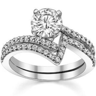 This beautiful Moissanite engagement ring features a modern bypass style design with 0.26ct of round brilliant Moissanite side stones prong set side stones, in 14k gold, 18k gold or platinum.