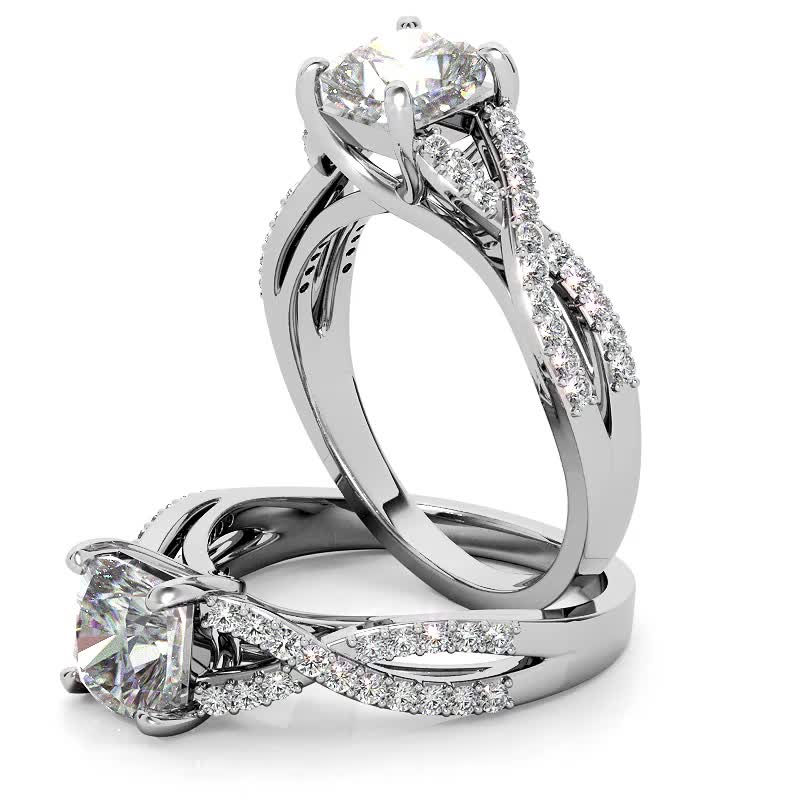 This beautiful Moissanite engagement ring features a split shank trellis cushion cut Moissanite center stone, 0.36 carat of round brilliant Moissanite side stones, set in 14k gold or platinum. Add the optional matching band to make it a complete bridal set.