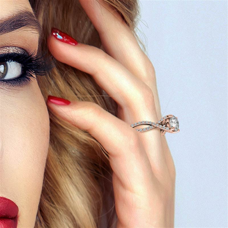 This beautiful engagement ring features a split shank trellis design, a round brilliant Moissanite center stone, 0.40ct of round brilliant Moissanite side stones, and is available in 14k gold, 18k gold or platinum.