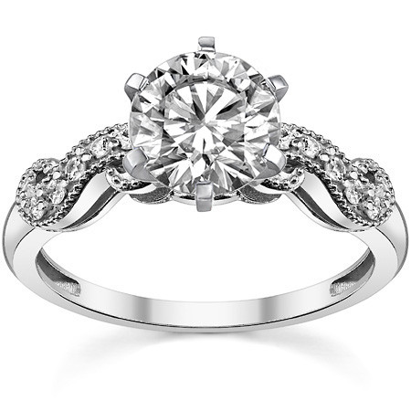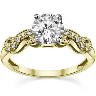 This beautiful Moissanite engagement ring setting features an antique style design with milgrain accents and 0.15 ct of round brilliant Moissanite side stones. It is available in 14k gold, 18k gold or platinum.