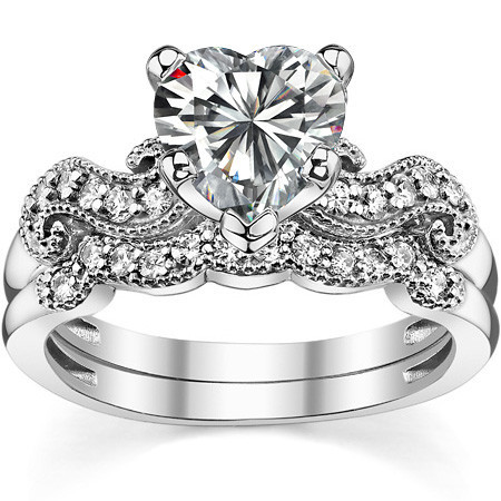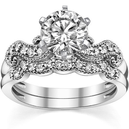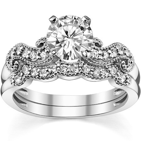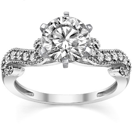 This beautiful Moissanite engagement ring setting features an antique style design with milgrain accents and 0.18 ct of round brilliant Moissanite side stones. It is available in 14k gold, 18k gold or platinum.
