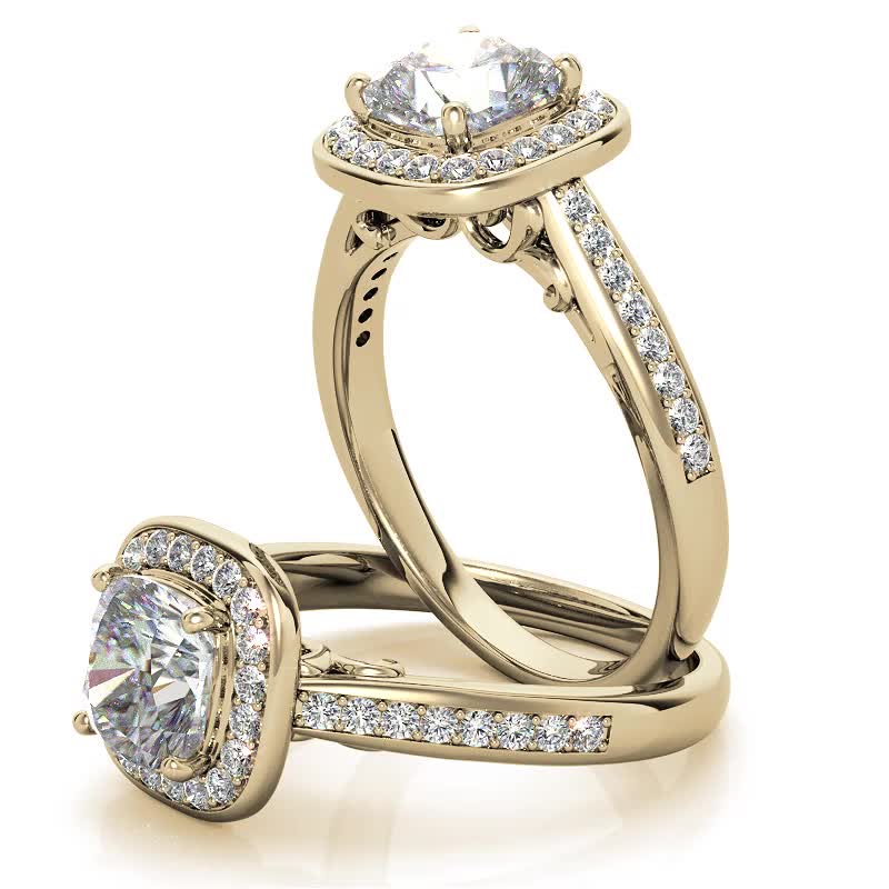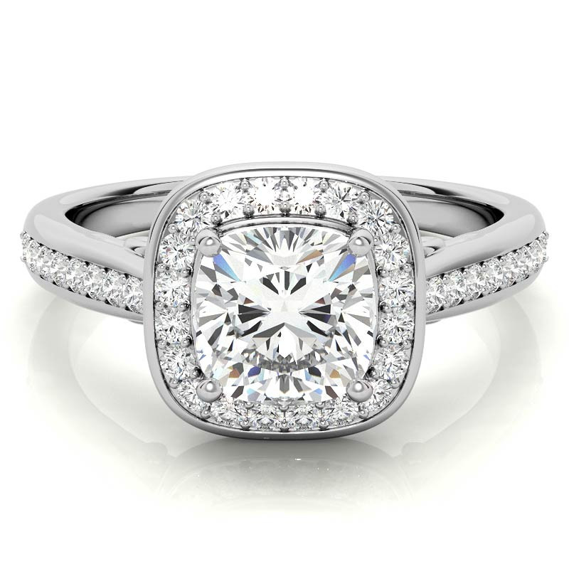 It is shown with a 1.4ct/6.5mm cushion cut center stone.