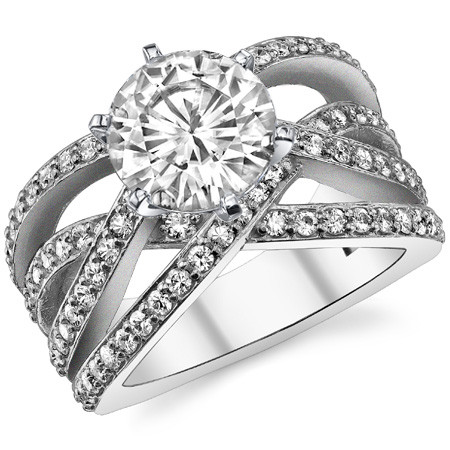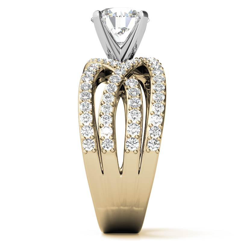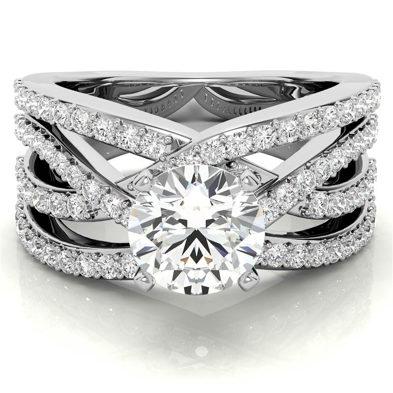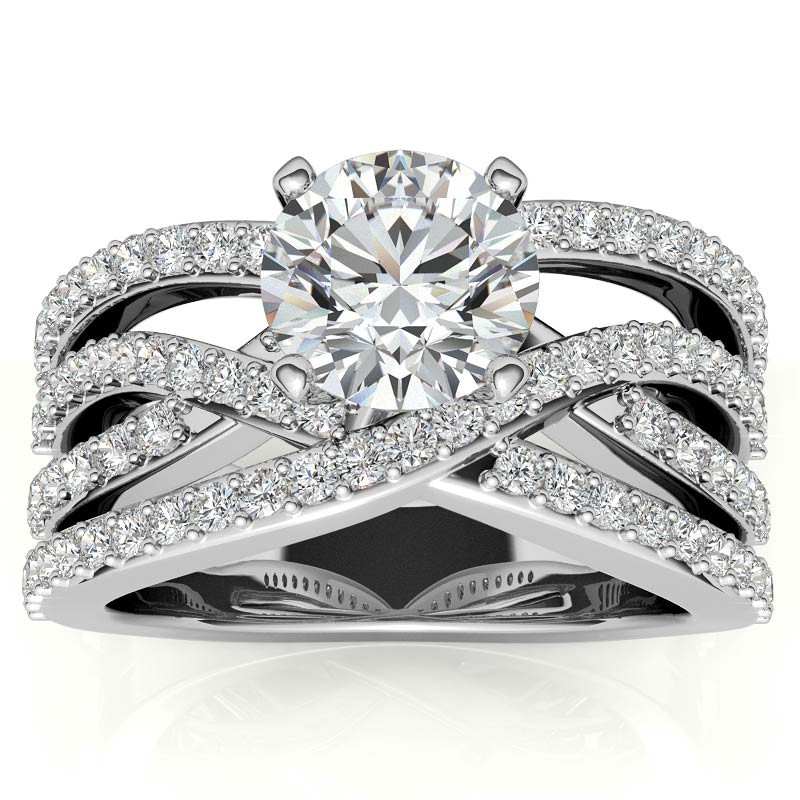 This beautiful Moissanite engagement ring setting features a woven, wide, multi-band design with 0.84 carat of round brilliant Moissanite side stones. It is available in 14k gold, 18k gold or platinum.