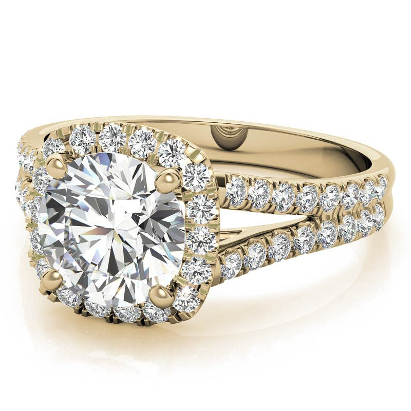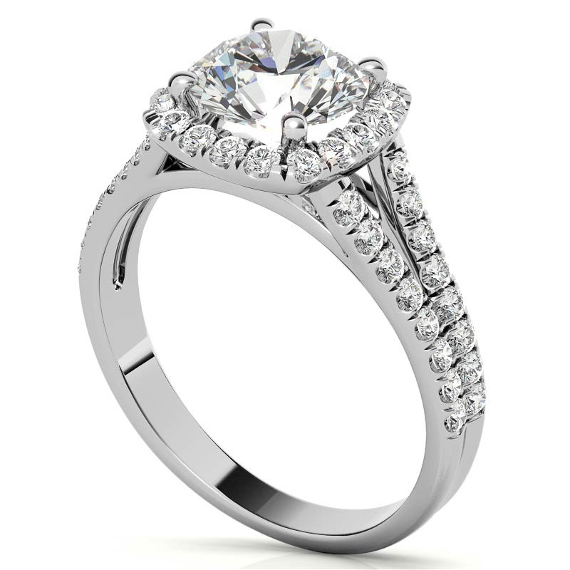 This beautiful engagement features an engagement ring with a lovely halo split shank design with a round brilliant Moissanite center stone set in a cushion shaped halo, 0.54ct of round brilliant Moissanite side stones, set in 14k gold, 18k gold or platinum.