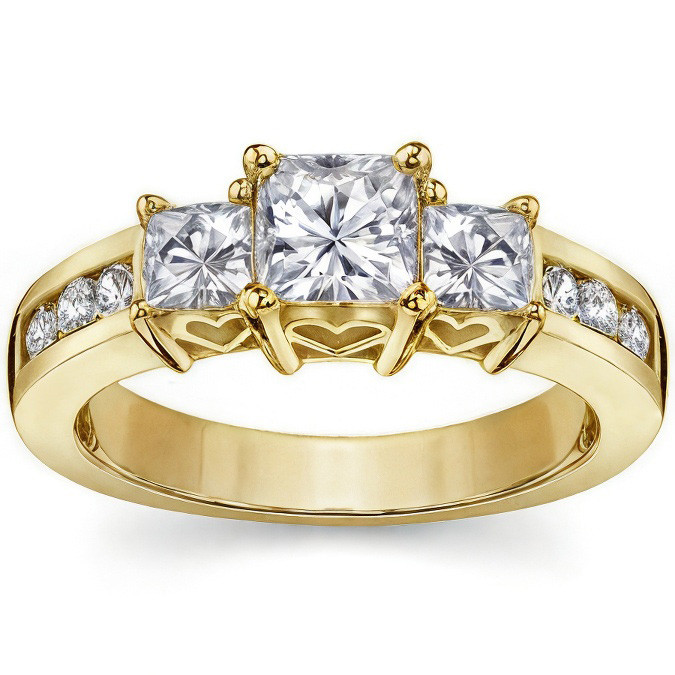 This beautiful Moissanite ring features a 1.05ct (5.5mm) princess cut Moissanite center stone, two 3.5mm princess and six 2.25mm round brilliant Moissanites (1.86ct total), set in 14k gold, 18k gold or platinum. (5.5mm x1, 3.5mm x2, 2.25mm x6)
