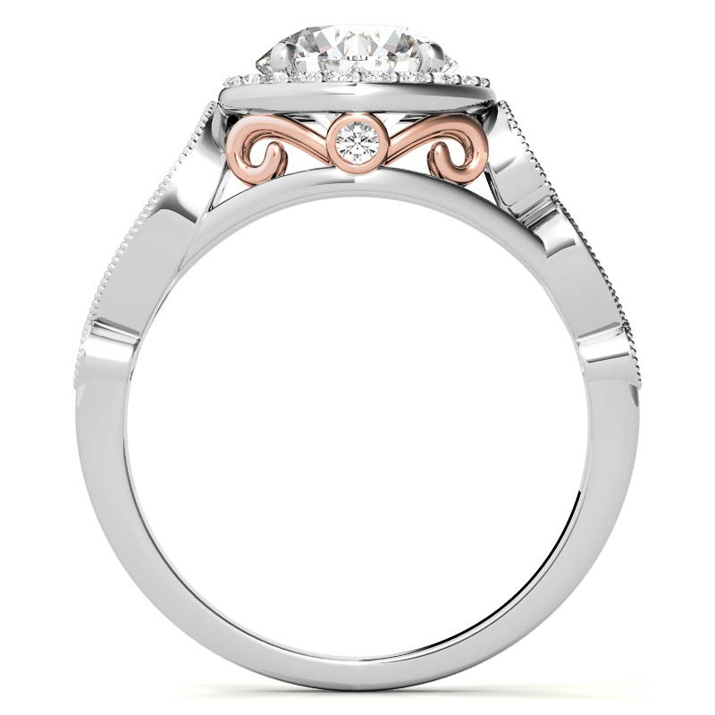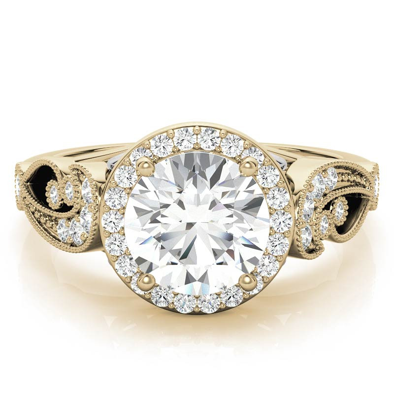 This beautiful Moissanite engagement ring features an antique styled halo design with milgrain accents, a round brilliant cut colorless Moissanite center stone, and is set in 14k gold, 18k gold or platinum. The combined carat weight of the round Moissanite side stones is 0.31ct.